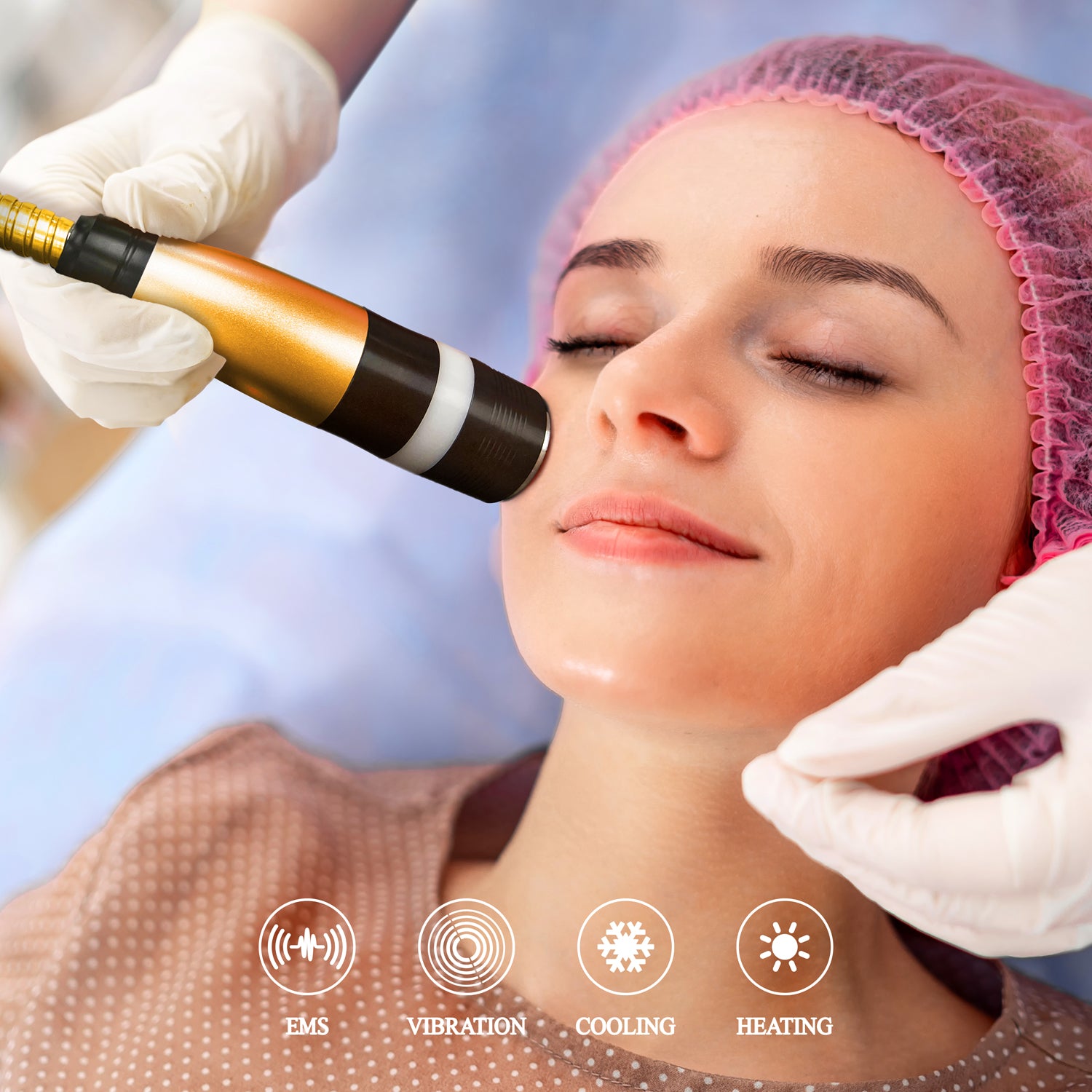 Electric Muscle Stimulation uses pain-free micro-currents to expand and contract muscles in a targeted area. The EMS function gently lifts and tones your skin, upping your collagen and elastin production. Your body uses these building blocks to restructure scaffolding under the skin's surface, remodeling from within. The result is more elastin fibers and collagen thickness.
