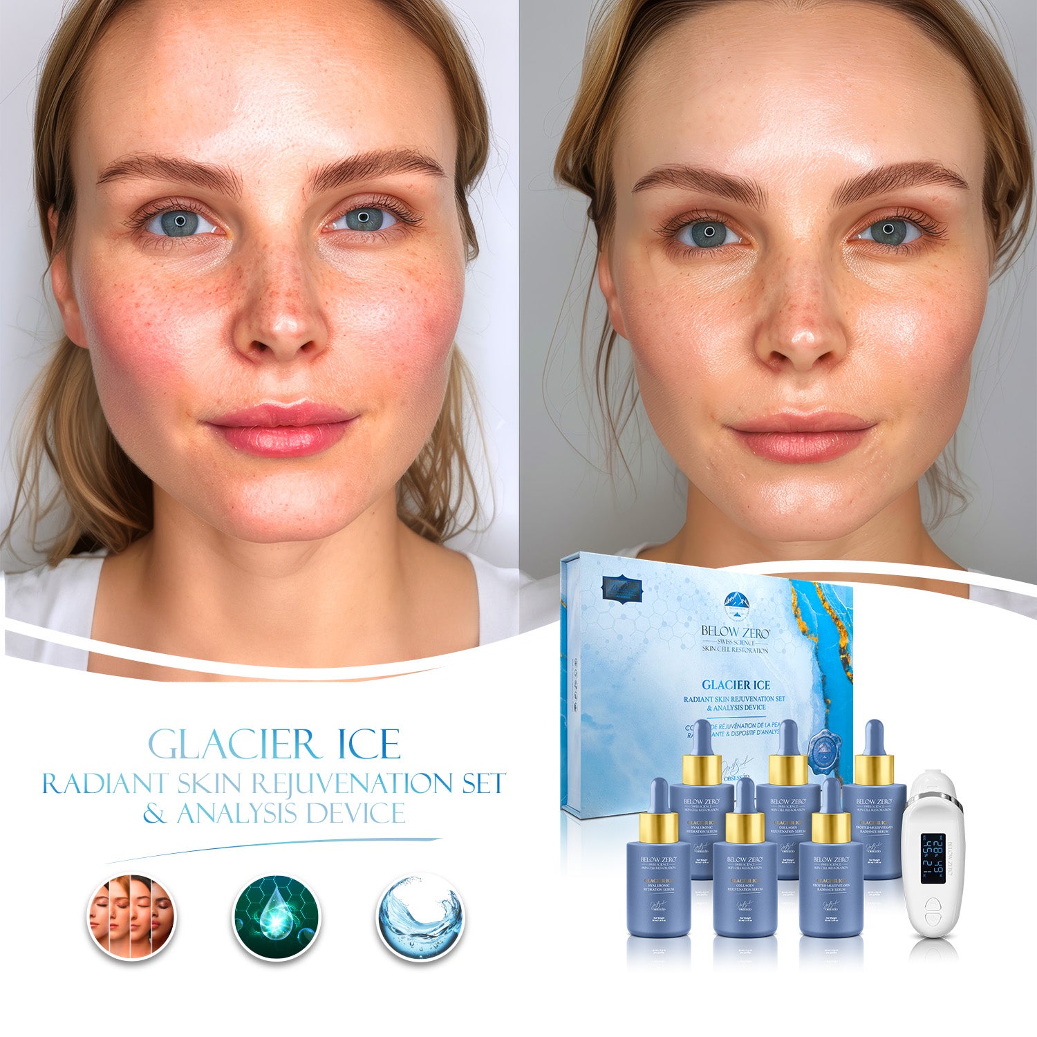 The Below Zero Glacier Ice Radiant Skin Rejuvenation Set & Analysis Device is your ultimate solution for personalized skincare. This advanced set features six potent droppers, each meticulously formulated with a base of caffeine and Multi-Peptides, designed to target a range of skin concerns.