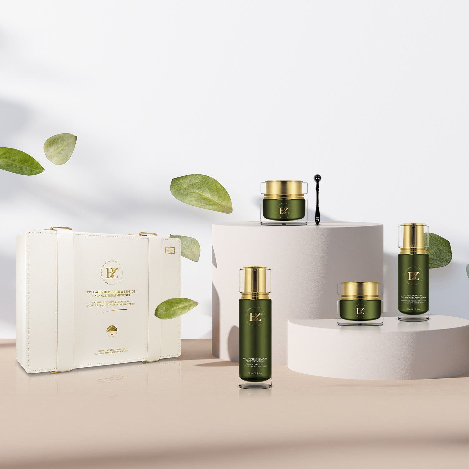 The Collagen Replenish & Multi-Peptide Balance Treatment Set embodies a refined ritual for those who seek versatility, comfort, and care in their skincare regimen. This four- piece collection brings together concentrated formulas enriched with collagen and multi-peptides, chosen for their link to skin texture, resilience, and revitalized appearance. Each product in this set is designed to stand independently or complement one another when used in combination, offering the freedom to personalize usage based on your individual needs. Whether used for replenishment, layered hydration, or sensorial care through thermal stimulation, this set supports a flexible approach to modern skin rituals. It includes a thermal activation mask, a touch-activated serum, a conditioning recovery cream, and a finishing layer mask—each created with intent, balance, and refinement in mind.