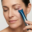 Gently place the treatment head against the skin and glide from the inner corner of the eye toward the temple using light pressure. You may also perform point-pressing motions, holding each point for about 10 seconds. Avoid staying in one spot for too long.